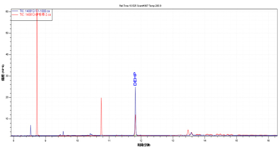 原辅料TIC图(粉色)与邻苯混标TIC图(粉色)