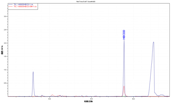 打样定制TIC图(绿色)与六溴环第十二烷实验室管理标准品TIC图(黄白色)