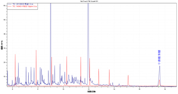 样件TIC图(蓝)与多溴联苯醚混标TIC图(黄白色)
