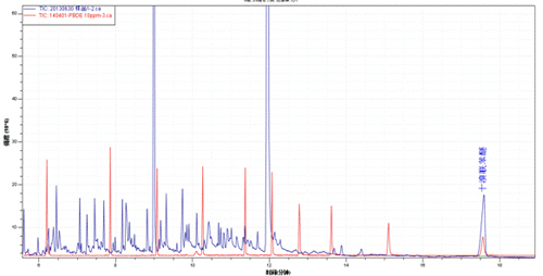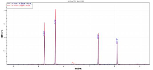 合格品TIC图(颜色)与多溴联苯醚混标TIC图(暗红色)