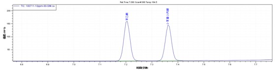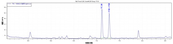 方针物在0.1ppm-2ppm线性杰出。取空缺鞋材样品加标,样品颠末丙酮超声萃取。1ppm加标程度下谱图以下,获得了比拟对劲的结果。