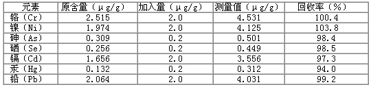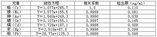 Hg标液零丁为两组。Cr 、Ni 、As 、Se 、Cd 和Pb 标液用各风格10μg/mL的标液浓缩液至需求浓度值。配置Hg标液时参与0.1mL 20 μg/mL金规则水溶液。阐发课题(表2)显现出,这7种风格的规则化方程组的相干因子为0.9996~1.000 ,检测出限为0.008~0.165ng/mL。