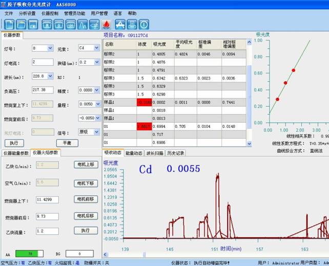 于原子核接收到光谱仪仪 228.8 nm 处,操作分为-乙炔贫燃烈焰,以水调零,勘界试液的吸光度,减去伴同试料的缺编试着悬浊液的吸光度,从目标任务曲在线杳出出错的镉溶度。