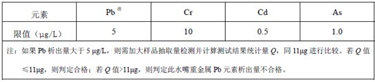 (1)GB/T 17219-1998《生活服供水输配水辅助装备及安全防护网相关资料的安静性评估报告格式正确》第一步对水嘴中镉、铅、砷、汞、铬等七种巨资属因素的溶解量责成被限,被限要求如表1如下图所示: