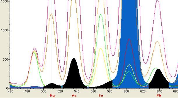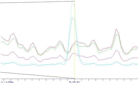Pb的图谱(虚谱展现不同之处含铁的谱峰)