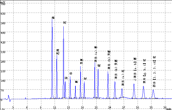 1. 苯 2.甲苯 3.间二甲苯 4.邻二甲苯 5.正十四烷 6.甲苯二异氰酸酯(I)7. 甲苯二异氰酸酯(II)9.己二异氰酸酯 10.异佛尔酮二异氰酸酯(I)11. 异佛尔酮二异氰酸酯(II) 12.二苯甲烷气体二异氰酸酯