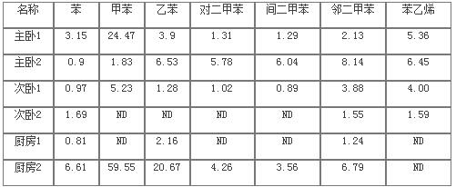 在刚装修完的两套室第的三处差别地址停止取样并阐发7种苯系物的含量,测试成果见表7。