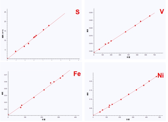 上图为利用EDX 6000C能量色散荧光光谱仪丈量差别含量煤油焦二次标样,成立S、V、Fe、Ni元素含量与强度的一次或二次校订任务曲线。由图可知,S、V、Fe、Ni组分含量与强度具备很是好的线性干系。