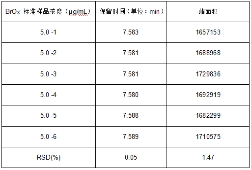 取5.0µg/mL溴酸根规范溶液反复进样6次,考查保留时候和峰面积的重现性,重现性成果详见表3。
